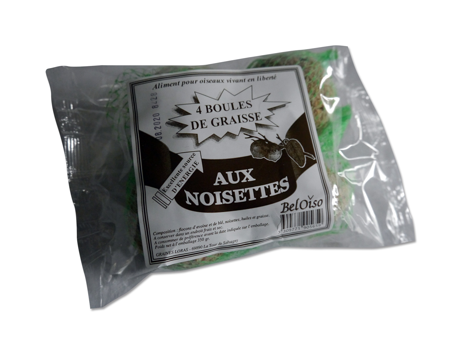 ALIMENTS COMPLÉMENTAIRES AUX NOISETTES PRÊTS A L'EMPLOI POUR OISEAUX SAUVAGES. Boule de graisse avec filet pour oiseaux de la nature composée de graisses, céréales et graines qui ont d'importantes qualités nutritives et qui constituent un apport alimentaire indispensable. De plus, les noisettes qu'elle contient permettent un apport supplémentaire en lipides. Grâce à ces boules de graisses suspendues, rouge-gorges, mésanges et petits oiseaux pourront résister au froid tout l'hiver.