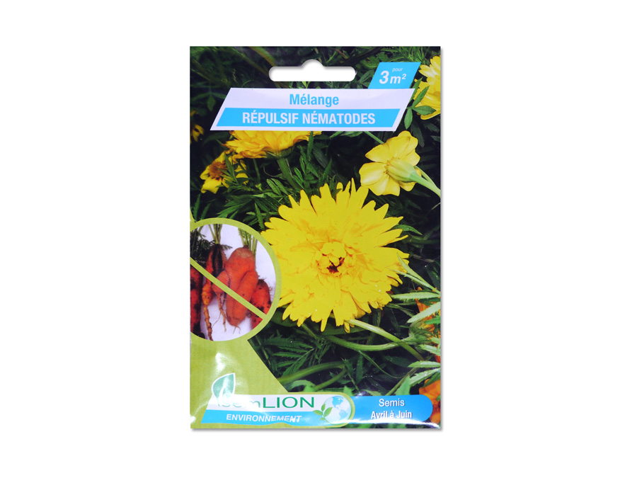 2 grammes par sachet - Mélange d'espèces annuelles d'Œillet d'inde haut avec pour principale le tagète anti-nématodes. Hauteur de 50 à 80 cm selon les espèces. Mélange composé d'espèces qui contribuent à éloigner les nématodes. A semer aux abords du potager. SOL : Ce mélange supporte tous les types de sols, à bonne exposition ensoleillée.